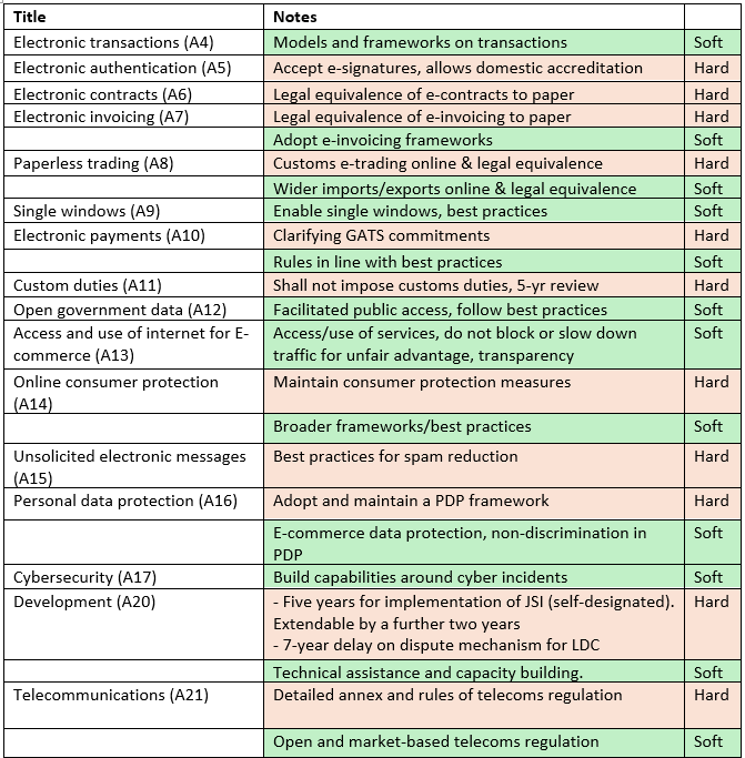 Much of the JSI text is written in “soft” rather than “hard” law (as shown in the table). This means that rules are not formally binding within law. Rather countries “endeavour to follow.” or “recognise the importance of..” specific rules. Agreeing to such softer rules can lead to momentum and may push political pressure from change, but provides more flexibility.