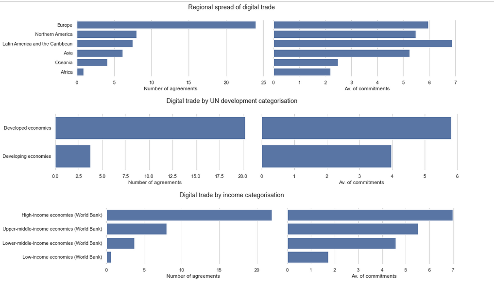 The right graph shows the balance between between hard (legally binding) and soft (not legally binding) rules. Although “soft law” was an earlier trend (c. 2005-2015) within digital trade, the split between hard and soft law in digital trade rules has stayed constant at around 40% hard/60% soft within recent years.