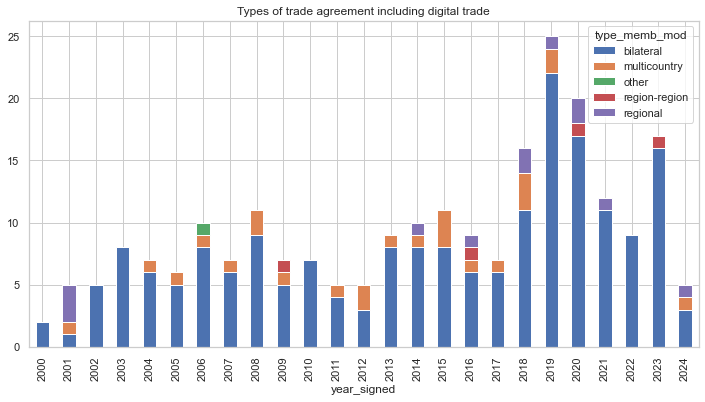 The above graph highlights the headline data -the number of trade agreements by year that include any clauses related to e-commerce or digital trade. It is divided by type of trade agreement.