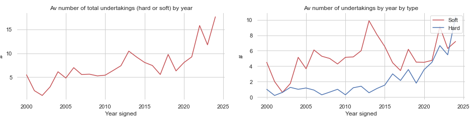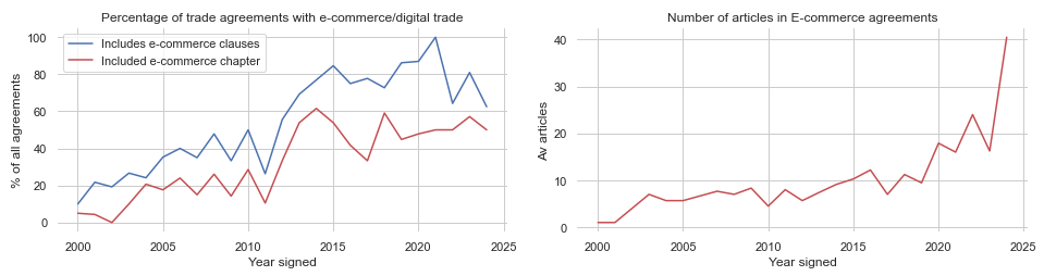 On the right graph, we can see that for agreements with a digital trade/e-commerce chapter, the average number of articles relating to digital trade/e-commerce is increasing over time. This shows the growing depth of content
